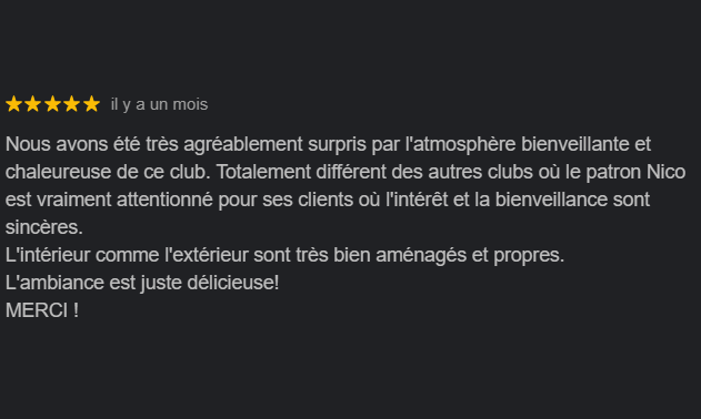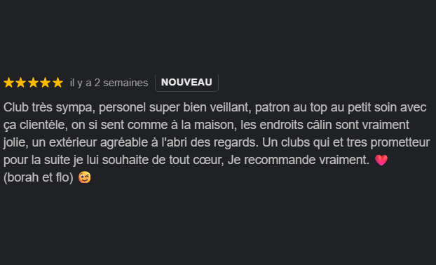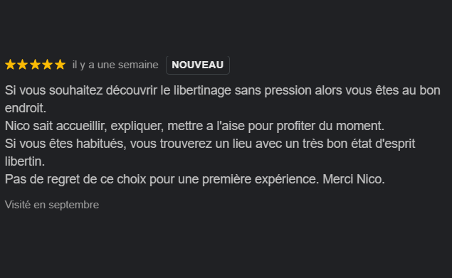 CLUB PRIVE EPICURIEN NOS EVENEMENTSBUFFET & BAR Un grand MERCI ! . . . pour tous vos avis positifs sur google . . . NOUVEAUX HORAIRES LUNDI : FerméMARDI : Fermé du MERCREDI au DIMANCHE 14-18h Balnéo en terrasse(bain bouillonnant, douche ext., sauna, hammam) 18-20h After Work20-2h Soirée couple mixte découvrez les thèmes crazy selon vos envies coquines … TARIFS Après-midi HOMMES : 30 €COUPLE : 20 €TRAV/TRANS : 10€FEMMES : entrée offerte After work Entrée offerte (*)* Accès aux bars et sous réserve de consommation– autres espaces accessibles sur paiement du ticket d’entrée – Soirées HOMMES : 50 € week end (V/S/D),30€ en semaineCOUPLE : 20 €TRAV/TRANS : 10€FEMMES : entrée offerteA partir de 18 heures, Tenue correcte et élégante exigée ! AGENDA cliquez ici pour le programme à venir ... ... Top Events ... Soirée » La Ruée vers l’or » 🫦⛺👢 (Jeu. 30.10)Soirée Bdsm (Ven. 31.10)Soirée de « Halloween » 🌕🎃🥂🕷️🕸️🫦😈🖤 (Sam. 01.11)Soirée » Transparence » 🫦🖤😋 (Dim. 02.11)Soirée » pyjama » (Mer. 05.11) ... Soirées privées... Special bukkake 🫦💧Special Bukkake 😈🫦 ... Voir le programme complet ... Suivez nous sur Wyylde (lien ci-dessous) … CRAZY LIB, 90 allée Jean Charcot83160 La Valette-du-VarTél : +33 6 65 70 70 38E-Mail: crazylib83@gmail.com Veuillez activer JavaScript dans votre navigateur pour remplir ce formulaire.Veuillez activer JavaScript dans votre navigateur pour remplir ce formulaire.Nom *PrénomNomE-mail *Téléphone Commentaire Nom E-mail Commentaire ou messageEnvoyer A PROPOS DE NOUS Crazy Lib, c’est la volonté de vous offrir le club privé le plus convivial du 83.Un espace sauna et hammam de qualité,des terrasses,de nombreux espaces de jeux et espaces câlins (plus grand glory hole du 83 !, croix de Saint André etc).Crazy Lib veut redevenir un club du début des années 2000, l’époque de l’âge d’or du libertinage !Les clients du club sont particulièrement sélectionnés pour garantir une totale sécurité et une atmosphère chaleureuse.Devenir membre du Crazy Lib vous permettra d’accéder à de nombreux services uniques du club privé ( accès aux évènements et restauration, …). Ajoutez votre titre ici